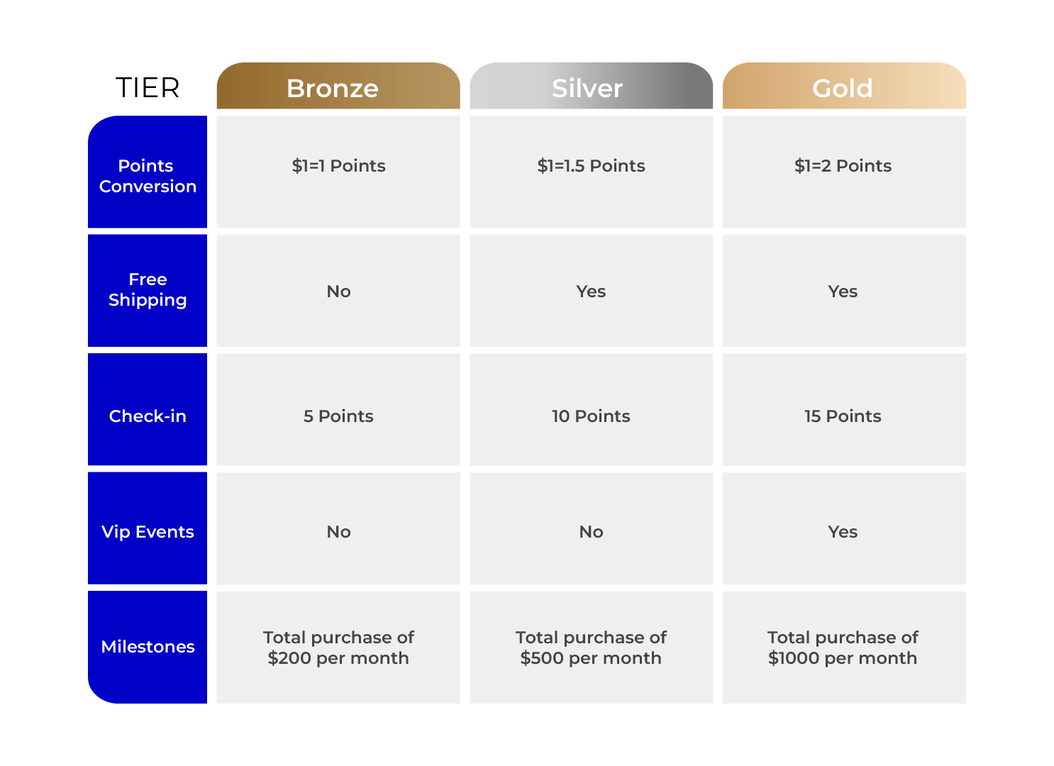 Earn bonus points based on their tier, product, or special occasions. Gold members get 3X rewards points on electronics, and Platinum members earn 5X rewards points on fashion.