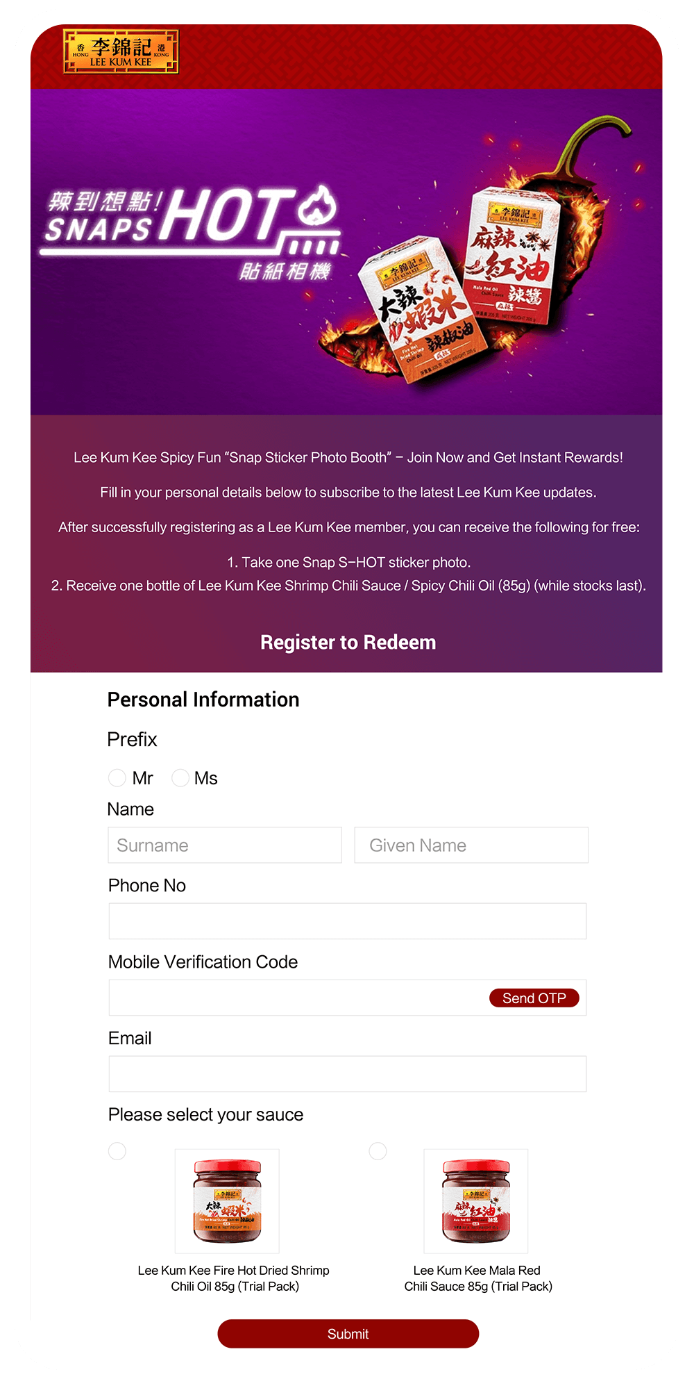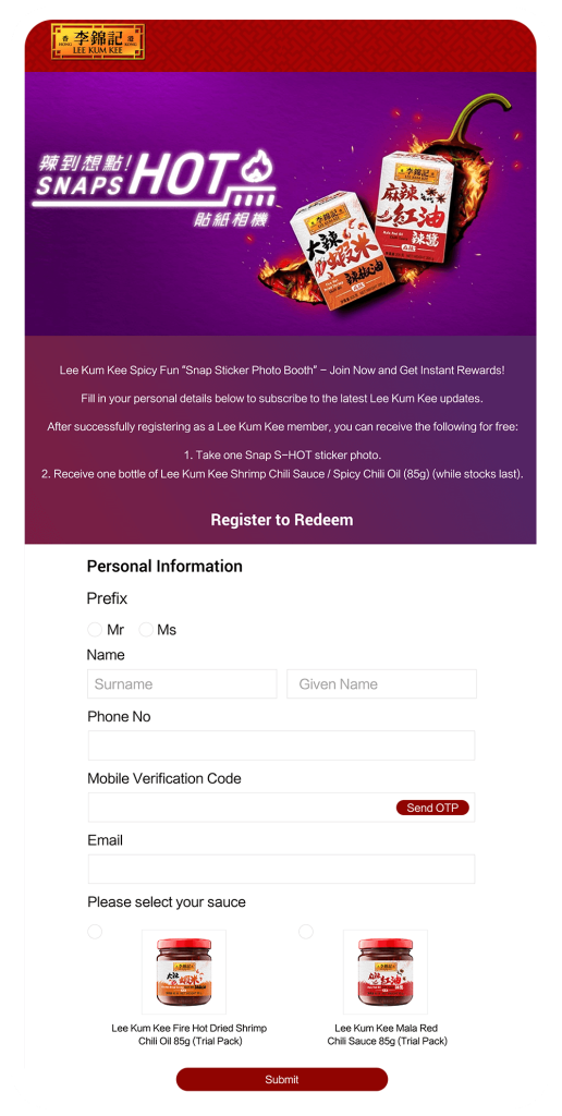 Our team began by running an event where visitors could sign up as members with a standalone quick registration form. Upon registration, Lee Kum Kee staff would scan the registration QR code to record the membership as part of the registration process. New members could take a photo in the photo booth and print it as a sticker photo. Additionally, they could receive a free spicy hot sauce. This created a solid member base before the launch of the Lee Kum Kee FunCook member app.