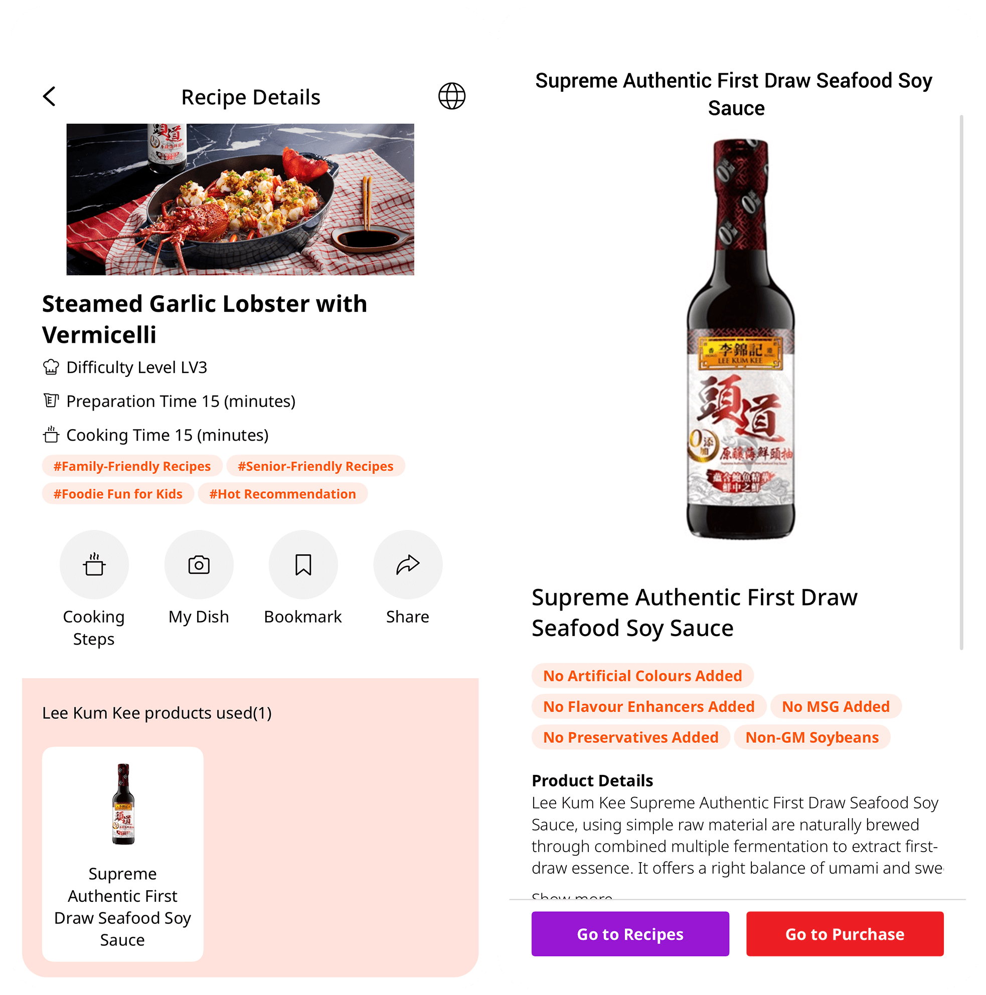 Our development team connected Lee Kum Kee’s online e-store to the app so engagement leads naturally to purchase. For example, after reading a recipe, a member who needs specific ingredients can open the product tab and purchase sauces or items directly.
