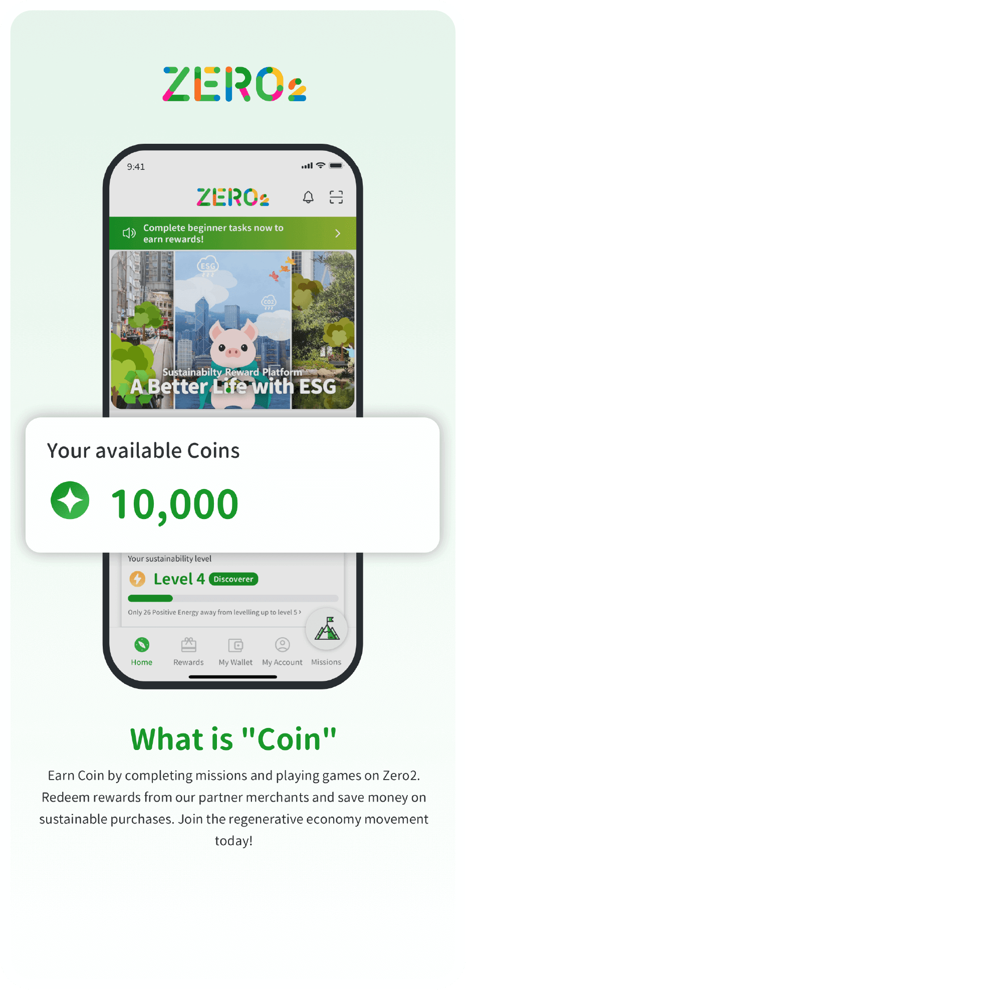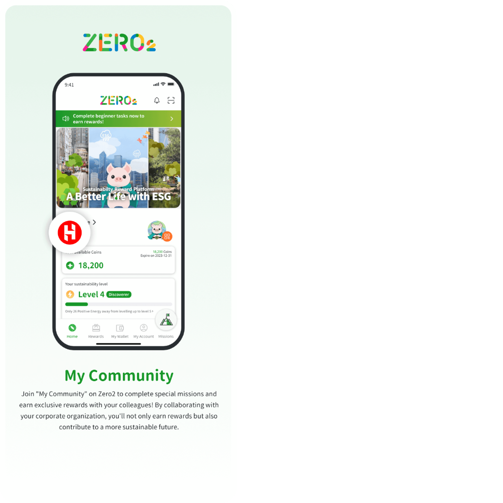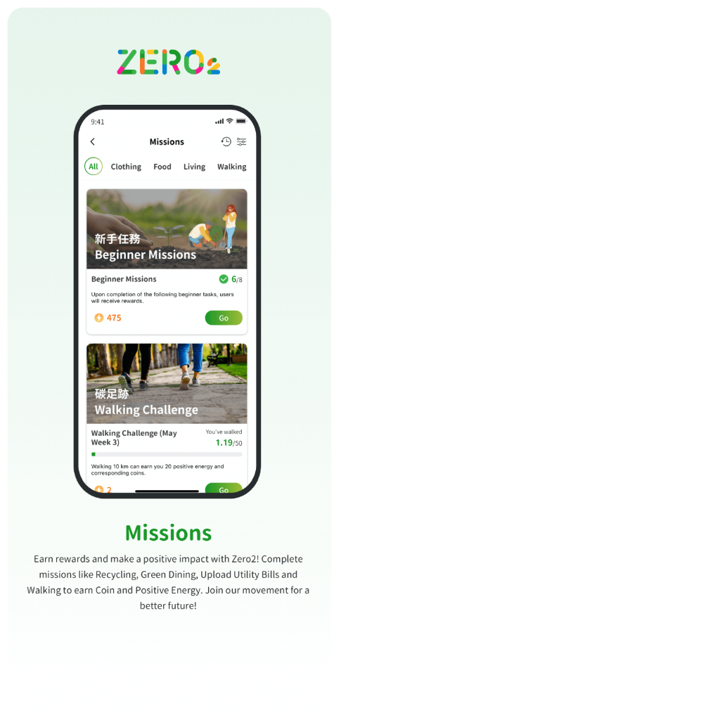 Missions reward everyday green actions such as walking, recycling, uploading utility bills, and choosing no disposable cutlery. The app turns these choices into points that reinforce good habits and keep members engaging.