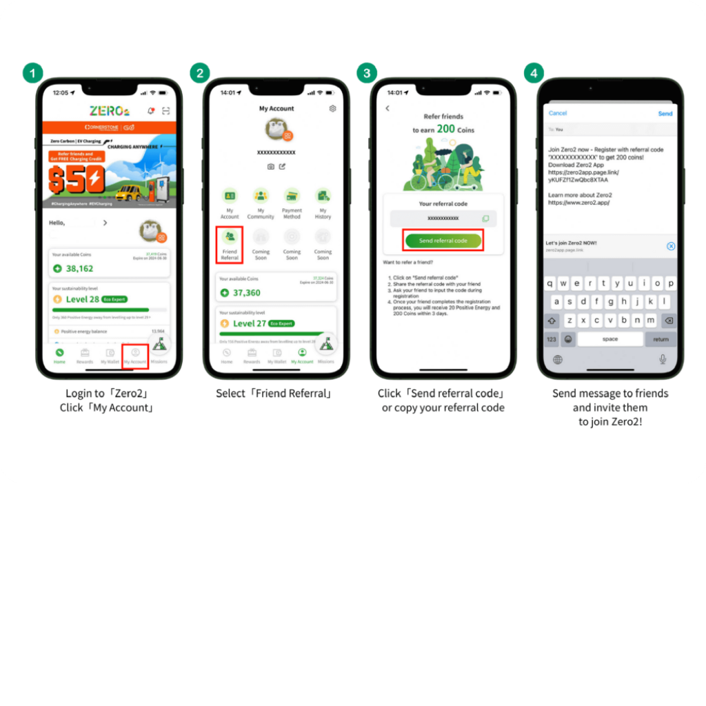 Members earn extra points or Zero Coins when they refer friends through a static referral code that simplifies tracking. Merchants can also refer other businesses to join ZERO2 and run exclusive referral incentives, for example a free EV charging voucher when a friend signs up.